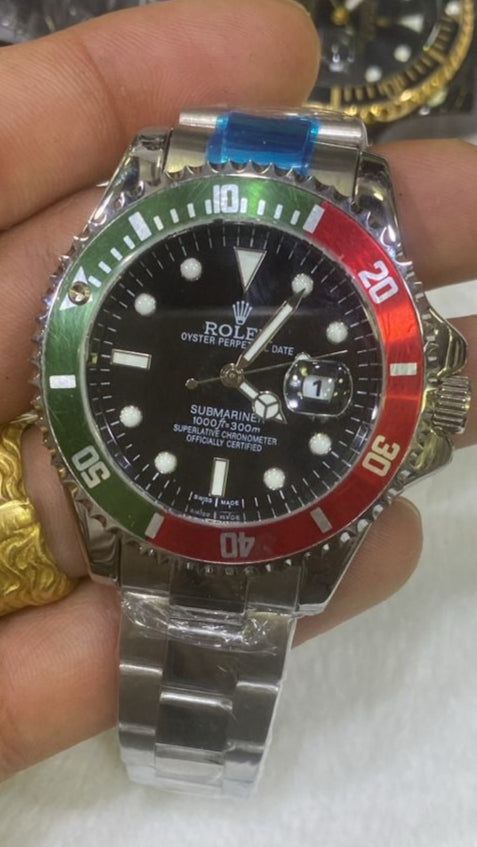 Relógio esportivo com bezel tricolor (verde/vermelho/prata), mostrador preto e ponteiros luminosos.